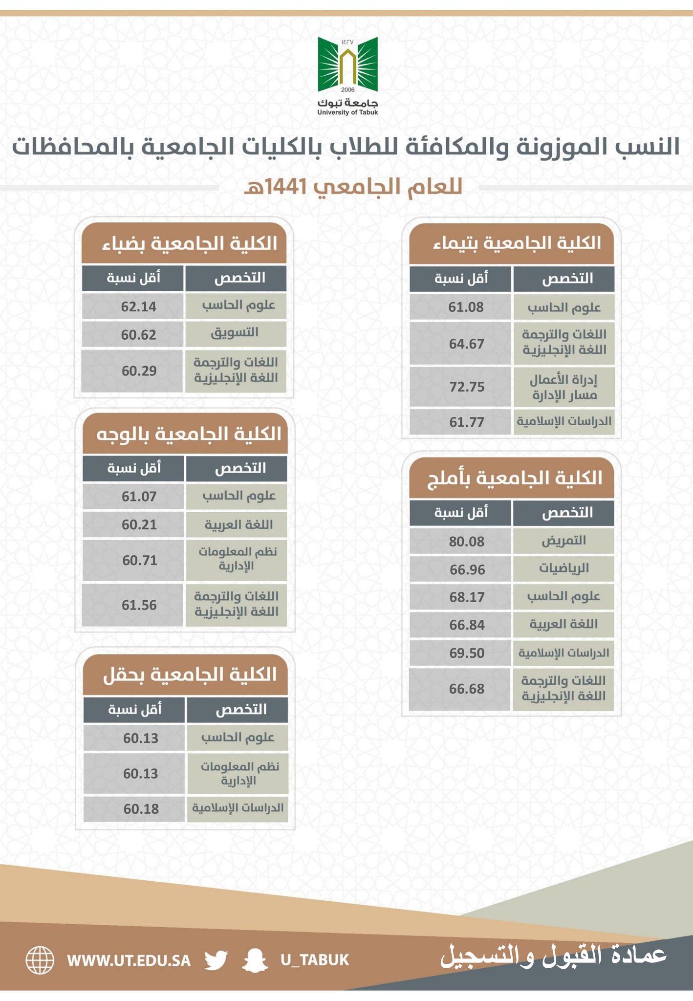 عمادة القبول والتسجيل En Twitter تعلن عمادة القبول والتسجيل جامعة تبوك عن أقل نسبة موزونة أو مكافئة تم قبولها في جميع التخصصات للطلاب والطالبات في مقر الجامعة الرئيسي والكليات الجامعية بالمحافظات للعام الجامعي